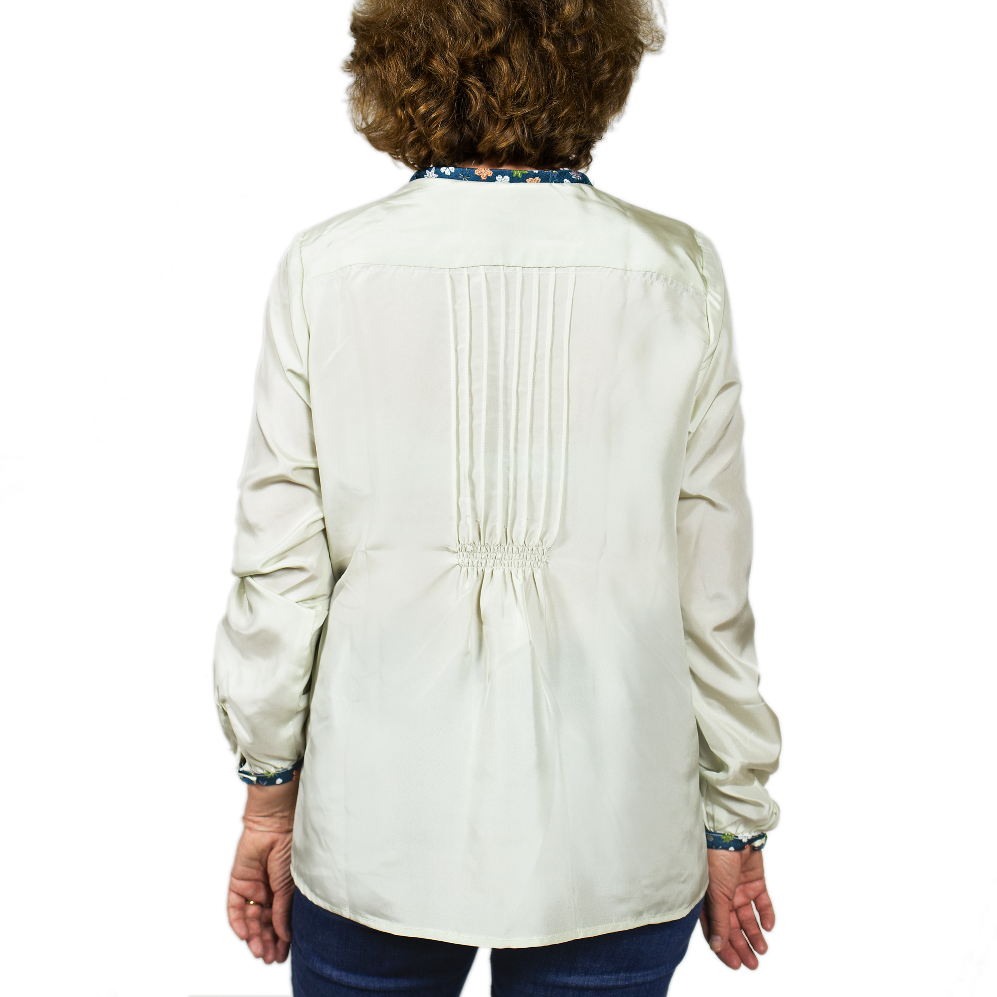 Camicetta lunga di seta bianca con sottili bordi di seta di obi giapponese color ottanio a fiori, retro plissettato e bottoni alle maniche fatti a mano
